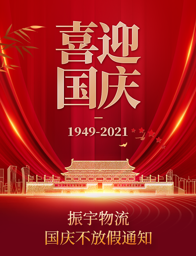 您好!正值秋高氣爽天,恰逢稻熟豐登日,祖國(guó)母親即將迎來(lái)72周年華誕。五星紅旗迎風(fēng)飄揚(yáng),我們同慶祖國(guó)華誕的榮光!振宇物流為了給您提供更好的服務(wù),并結(jié)合我司實(shí)際情況,現(xiàn)對(duì)國(guó)慶假日期間做出如下工作安排: