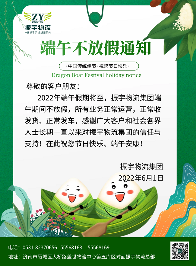 2022年端午假期將至,振宇物流集團(tuán)端午期間不放假,所有業(yè)務(wù)正常運(yùn)營,正常收發(fā)貨、正常發(fā)車,感謝廣大客戶和社會各界人士長期一直以來對振宇物流集團(tuán)的信任與支持!在此祝您節(jié)日快樂、端午安康!