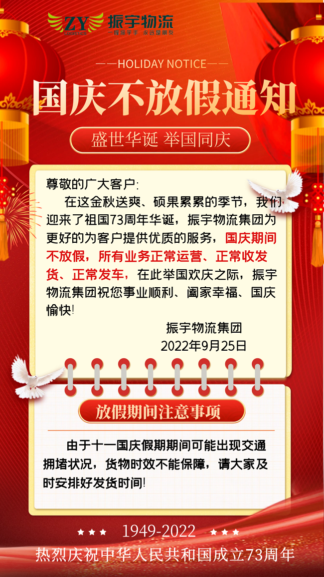 在這金秋送爽、碩果累累的季節(jié),我們迎來(lái)了祖國(guó)73周年華誕,振宇物流集團(tuán)為更好的為客戶提供優(yōu)質(zhì)的服務(wù),國(guó)慶期間不放假,所有業(yè)務(wù)正常運(yùn)營(yíng)、正常收發(fā)貨、正常發(fā)車,在此舉國(guó)歡慶之際,振宇物流集團(tuán)祝您事業(yè)順利、闔家幸福、國(guó)慶愉快!