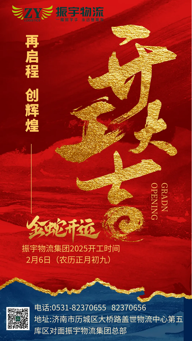 新春開工,瑞氣盈門!告別舊歲的忙碌,振宇物流在2025年的燦爛春光里,再次揚帆起航,于2月6日(農(nóng)歷正月初九)正式開工!過去的成績是基石,新的一年,全體員工定以飽滿的熱情,用專業(yè)與高效,服務(wù)每一位客戶,全力奔赴新征程,向著更高的目標破浪前行 。