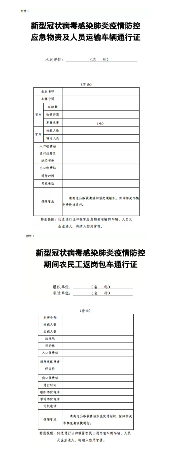 通知要求,地方各級(jí)交通運(yùn)輸部門(mén)要認(rèn)真落實(shí)《交通運(yùn)輸部關(guān)于切實(shí)保障疫情防控應(yīng)急物資運(yùn)輸車(chē)輛順暢通行的緊急通知》和《交通運(yùn)輸部關(guān)于疫情防控期間免收農(nóng)民工返崗包車(chē)公路通行費(fèi)的通知》要求,切實(shí)簡(jiǎn)化“新型冠狀病毒感染肺炎疫情防控應(yīng)急物資及人員運(yùn)輸車(chē)輛通行證”(簡(jiǎn)稱(chēng)“車(chē)輛通行證”)、“新型冠狀病毒感染肺炎疫情防控期間農(nóng)民工返崗包車(chē)通行證”(簡(jiǎn)稱(chēng)“包車(chē)通行證”)辦理流程,通過(guò)政府網(wǎng)站、微信、電子郵件等便捷方式提供“車(chē)輛通行證”“包車(chē)通行證”統(tǒng)一式樣,供承運(yùn)單位或駕駛?cè)嗽诒镜刈孕写蛴 ⒆孕刑顚?xiě)。