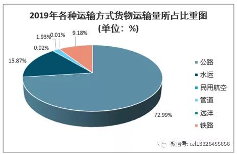 從貨物運輸的方式拉看,公路運輸仍然占據著我國貨物運輸行業(yè)的主導地位。2019年各種貨運運輸量中公路運輸量占比最大,達到了72.99%;其次為水運,占比為15.87%;鐵路運輸量占比9.18%,位居第三。我國民航運輸業(yè)起步較晚,仍處于發(fā)展階段,貨機數量整體來說相對較少,這導致2019年民航貨運量占比僅有0.02%。