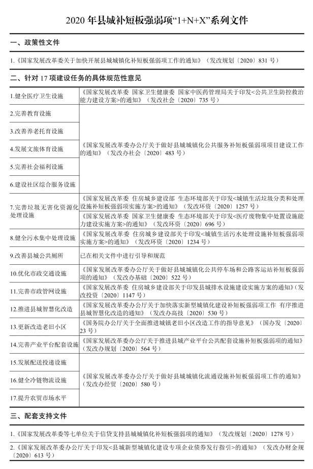 2020年5月29日,國家發(fā)展改革委印發(fā)《關于加快開展縣城城鎮(zhèn)化補短板強弱項工作的通知》,聚焦縣城及縣級市城區(qū),兼顧鎮(zhèn)區(qū)常住人口10萬以上的非縣級政府駐地特大鎮(zhèn)、2015年以來“縣改區(qū)”“市改區(qū)”形成的地級及以上城市市轄區(qū),將公共服務設施、環(huán)境衛(wèi)生設施、市政公用設施、產(chǎn)業(yè)培育設施4大領域共17項建設任務作為建設重點,明確了總體要求、主要任務、要素保障和組織實施方式,公布了縣城城鎮(zhèn)化補短板強弱項項目范疇和縣城新型城鎮(zhèn)化建設示范地區(qū)名單。