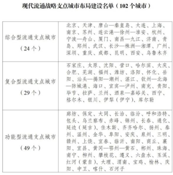 《通知》堅(jiān)持系統(tǒng)思維和全局觀念,突出國(guó)家所需和城市所長(zhǎng),按照服務(wù)重要商品和資源要素流通、強(qiáng)化跨域跨界輻射帶動(dòng)、促進(jìn)現(xiàn)代流通發(fā)展等三個(gè)維度布局流通支點(diǎn)城市。綜合考慮城市資源稟賦、發(fā)展基礎(chǔ)、比較優(yōu)勢(shì)、未來潛力,將102個(gè)城市納入布局建設(shè)范圍,覆蓋全國(guó)31個(gè)省區(qū)市以及新疆生產(chǎn)建設(shè)兵團(tuán)。流通支點(diǎn)城市將按綜合型、復(fù)合型、功能型分類推進(jìn)建設(shè),城市人民政府發(fā)揮主體作用部署推進(jìn),努力提升自身發(fā)展水平,增強(qiáng)輻射帶動(dòng)作用。