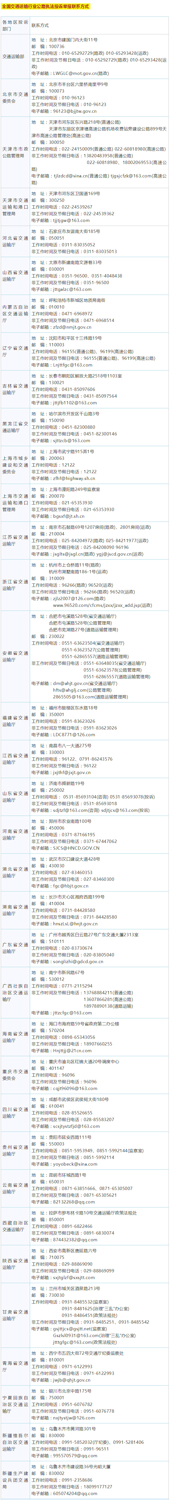 交通運(yùn)輸部公路局、道路運(yùn)輸司聯(lián)合向社會(huì)集中公布全國交通運(yùn)輸行業(yè)公路執(zhí)法行風(fēng)投訴舉報(bào)電話、通信地址和電子郵箱地址。