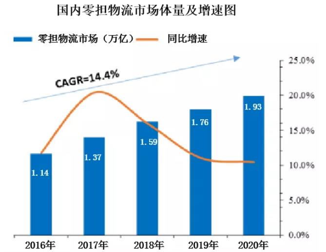 專家預(yù)測(cè),到2020年,零擔(dān)物流(即專線物流)行業(yè)市場(chǎng)體量將達(dá)到近2萬(wàn)億元。從2016年開(kāi)始,整個(gè)市場(chǎng)都在以10%以上的速度在增長(zhǎng),發(fā)展前景十分廣闊。