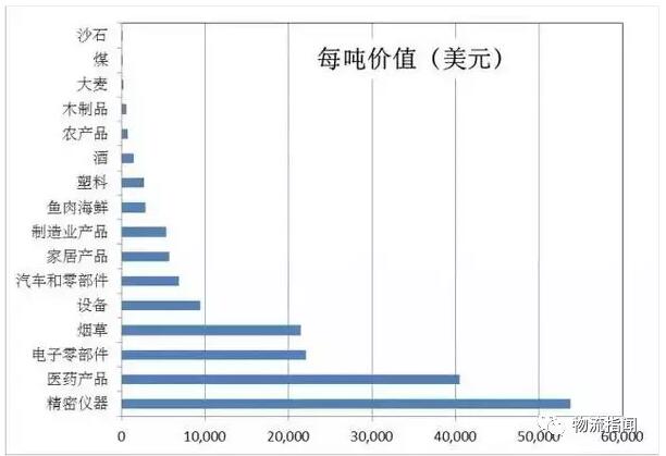 其次是經(jīng)濟水平?jīng)Q定的貨物價值。同樣一公斤貨,因為單公斤貨物價值的不同會對GDP產(chǎn)生很大影響。例如下圖是美國不同類別的貨物平均每噸的價值,可以看到差別非常大,一噸煤和一噸煙草價值可以相差100倍。同樣一噸貨物,價值更高對應的GDP就更高。