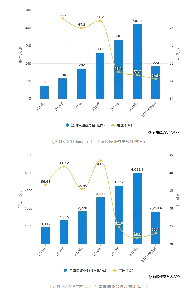 進(jìn)入2019年5月,全國快遞服務(wù)企業(yè)業(yè)務(wù)量為52.3億件,同比增長25.2%;業(yè)務(wù)收入達(dá)618.1億元,同比增長24.2%。累計(jì)方面,2019年1-5月,全國快遞服務(wù)企業(yè)業(yè)務(wù)量累計(jì)達(dá)到223億件,同比增長24.9%;業(yè)務(wù)收入累計(jì)達(dá)到2753.6億元,同比增長23.1%。
