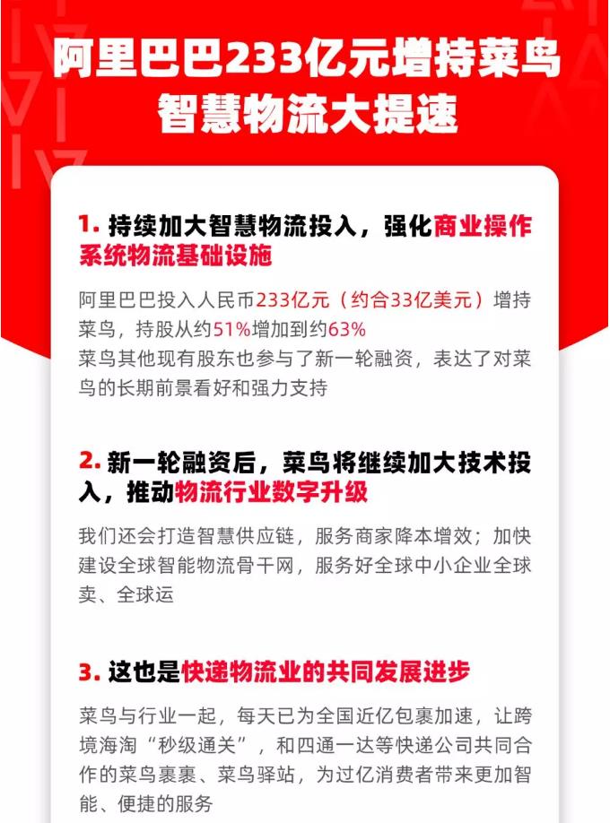 阿里巴巴集團11月8日宣布,為持續(xù)加大智慧物流投入,強化商業(yè)操作系統(tǒng)物流基礎設施,已領銜完成對菜鳥網絡新一輪增資。阿里巴巴通過增資和購買老股的方式,投入人民幣233億元(約合33億美元),持有菜鳥股權從約51%增加到約63%。菜鳥其他現有股東也參與了新一輪融資,表達了對菜鳥的長期前景看好和強力支持。